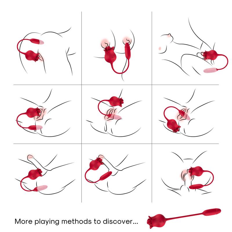Un juguete con el que disfrutar de mil maneras posibles. En la parte superior un estimulador con forma de rosa con 10 funciones de movimiento licking o lengua, y en la parte de abajo un huevo vibrador con 10 funciones de vibración y de movimiento up and down o thrusting.